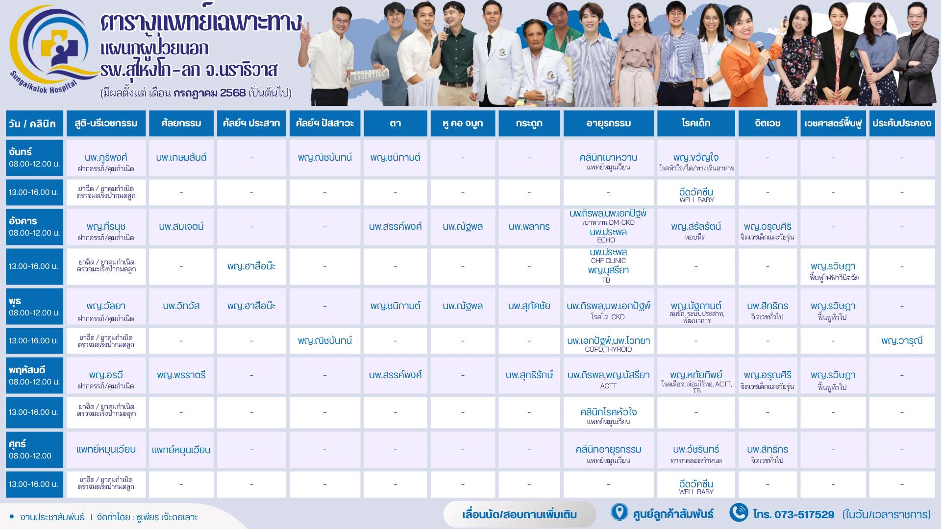 ตารางแพทย์ตรวจ OPD เฉพาะทาง โรงพยาบาลสุไหงโก-ลก