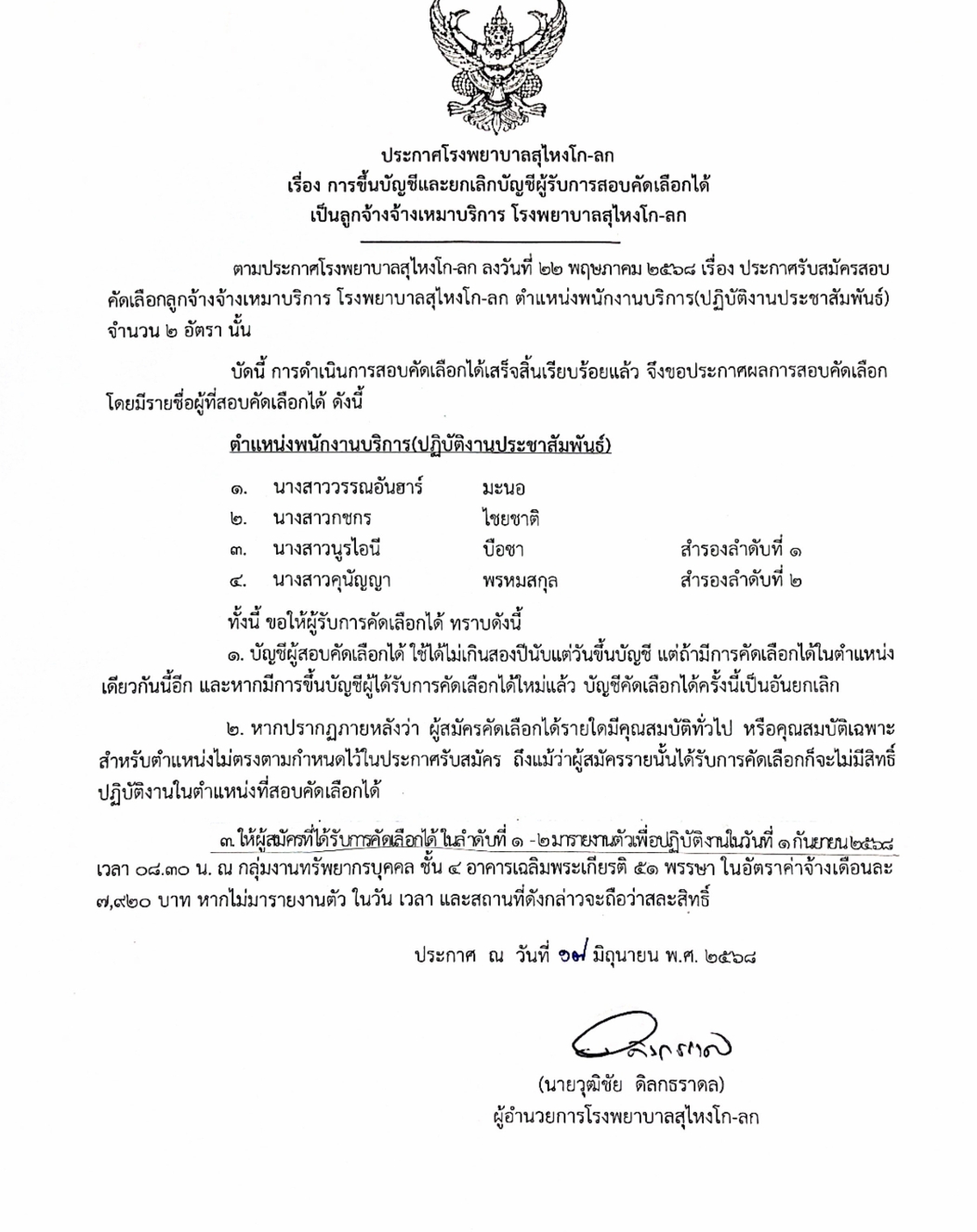 ประกาศการขึ้นบัญชีและยกเลิกบัญชีผู้รับการสอบคัดเลือกได้เป็นลูกจ้างจ้างเหมาบริการ ตำแหน่งพนักงานบริการ(ปฏิบัติงานประชาสัมพันธ์)
