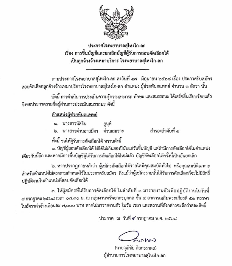 ประกาศการขึ้นบัญชีและยกเลิกบัญชีผู้รับการสอบคัดเลือกได้เป็นลูกจ้างจ้างเหมาบริการ ตำแหน่งผู้ช่วยทันตแพทย์