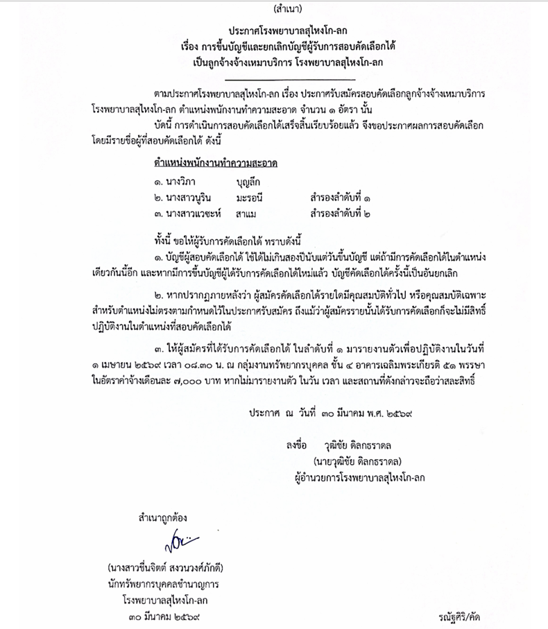 ประกาศการขึ้นบัญชีและยกเลิกบัญชีผู้รับการสอบคัดเลือกได้เป็นลูกจ้างจ้างเหมาบริการ ตำแหน่งพนักงานทำความสะอาด